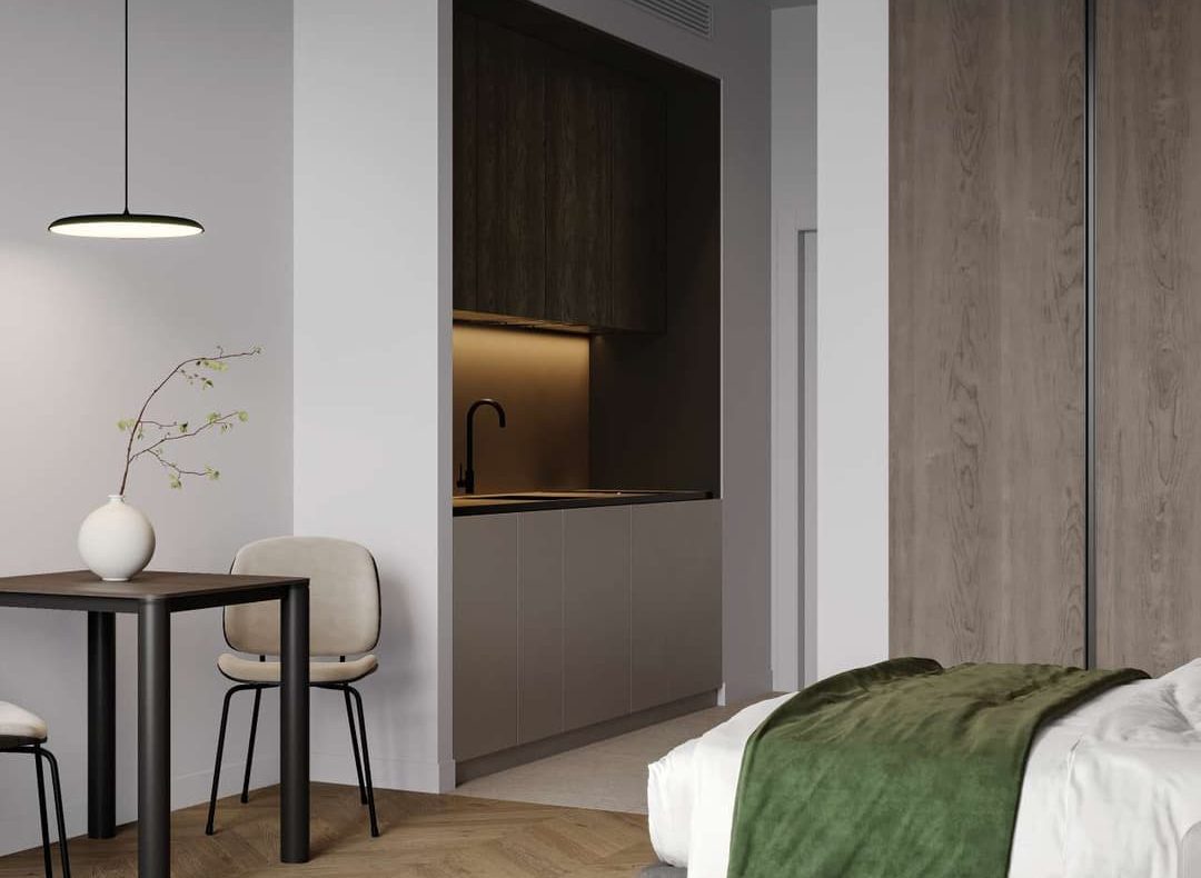 Inside, the residences are a showcase of refined simplicity and elegant design. The project offers a selection of studios, 1-bedroom, 1.5-bedroom, and 2.5-bedroom apartments, each with spacious layouts and soft, neutral interiors. Large windows invite sunlight into every corner of the home, while natural wood accents and clean finishes create a warm, welcoming ambiance. Every apartment is designed to promote comfort and sophistication, ideal for those who value both style and function in their everyday living.