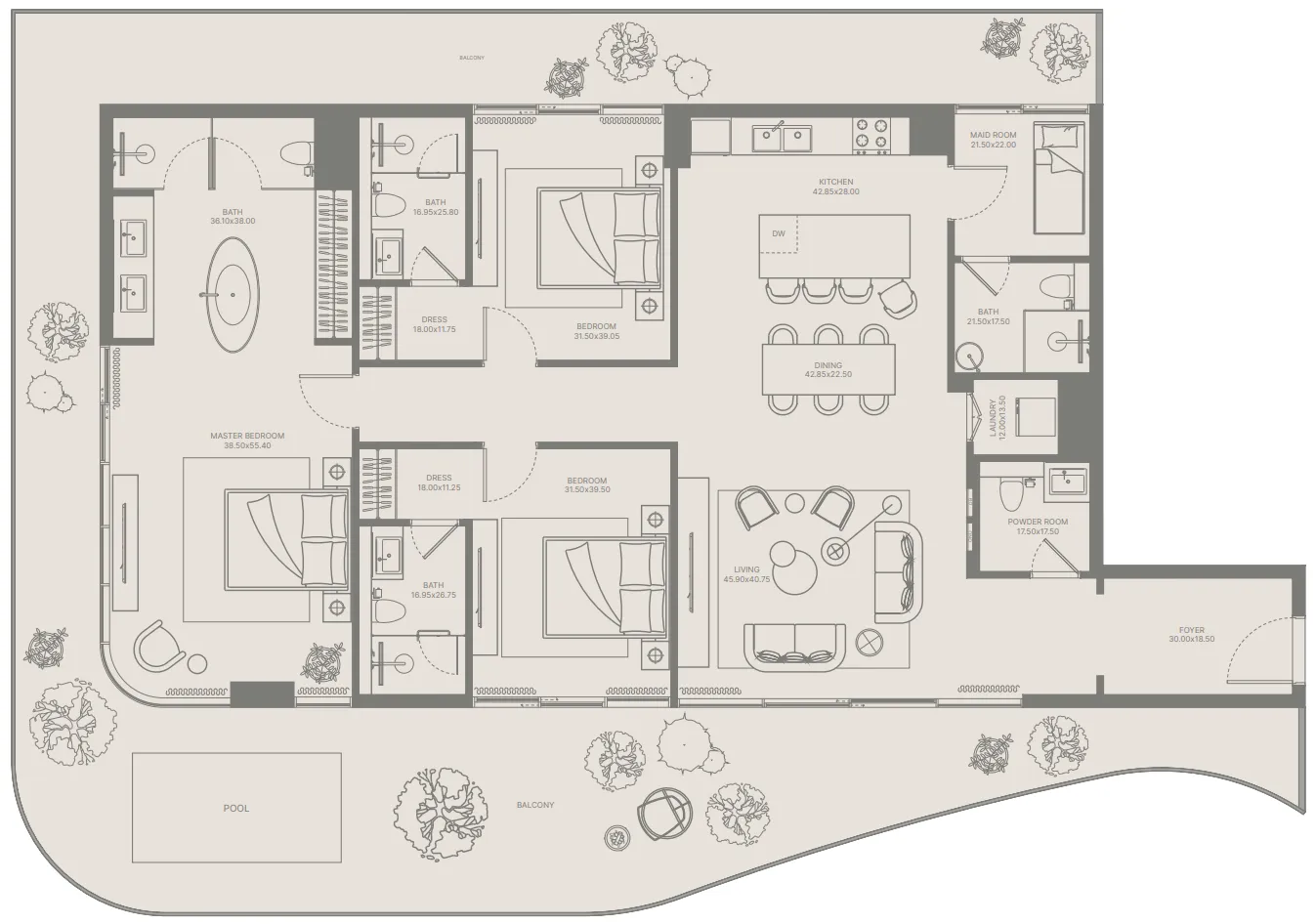 The project features meticulously curated amenities, blending relaxation and recreation. The infinity pool, surrounded by a meandering river, serves as a tranquil retreat, while the natural yoga zone and high-performance gym provide spaces for wellness and fitness. Social and leisure areas such as the outdoor clubhouse, the Royale Social Salon with unique entertainment options, and child-friendly playgrounds ensure a dynamic and inclusive lifestyle for all residents.