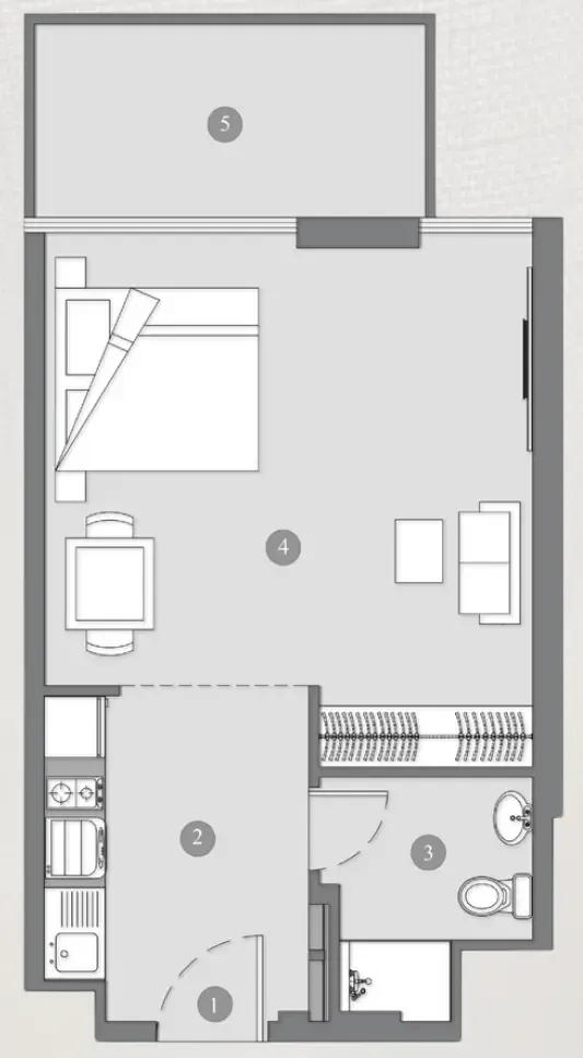 Inside, the residences range from smartly designed studios to spacious one- and two-bedroom apartments. Interiors are planned for maximum comfort and efficiency, combining open layouts, abundant natural light, and refined finishes. Each unit reflects a balance of style and functionality, ensuring a home environment that feels both sophisticated and welcoming.