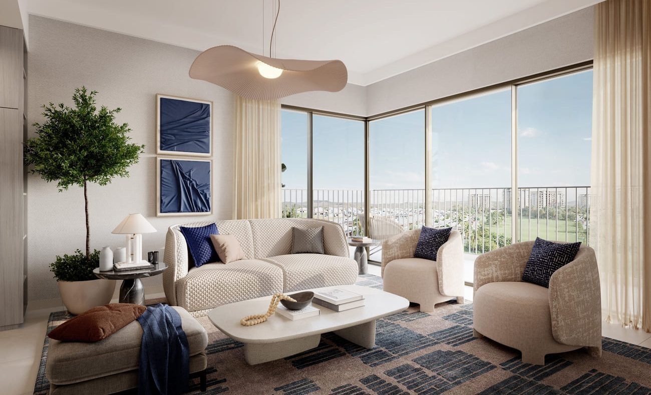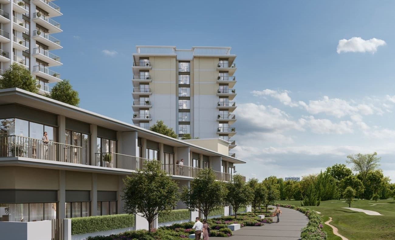 The architectural masterpiece delivers a refined version of contemporary beauty to redefine elegance to rejuvenate. The façade functions as a beautiful architecture ensemble which harmonizes modern design elements with timeless beauty. The exterior combines earth-inspired tones which merge perfectly with the natural environment. The building designs with their straight lines and large balconies with large windows present a powerful yet warm structure that fits perfectly with the course’s green landscape. Every architectural structure achieves environmental harmony through considerate material choices with textural elements thus providing residents with aesthetic functionality.