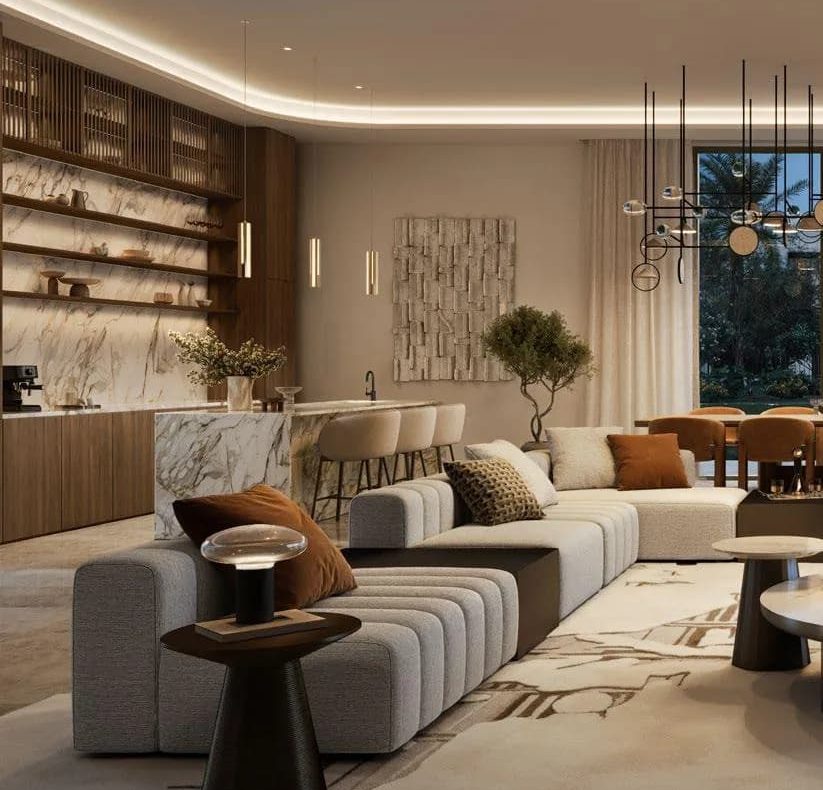 Interiors at Mareva celebrate texture, natural tones, and refined finishes, creating atmospheric spaces grounded in warmth and sophistication. Earthy palettes, soft beiges, and premium materials evoke a calming sensory experience, while marble-clad bathrooms and spacious living areas emphasize contemporary luxury. Kitchens, bathrooms, and living zones are designed with meticulous attention to detail, blending functionality with elegance to deliver a high-end lifestyle inspired by the natural beauty of The Oasis. Each residence reflects Emaar’s commitment to craftsmanship, quality, and elevated modern living.