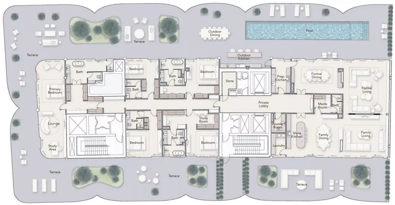 The elite development will feature a collection of extravagant 2-bedroom single and dual aspect apartments, 3–4 bedroom dual aspect residences and 2–4 bedroom duplexes with floor plan spaces from 1,642 sq. ft to 9,917 sq. ft. Those opting for more comfort and luxuriousness may want to acquire one of the 3 uber-elite properties, namely 1 dual aspect 6-bedroom presidential suite with a minimum size of 11,770 sq. ft and 2 corner aspect 5-bedroom penthouses of either 14,037 sq. ft or 14,369 sq. ft.