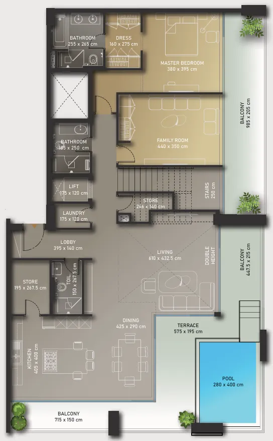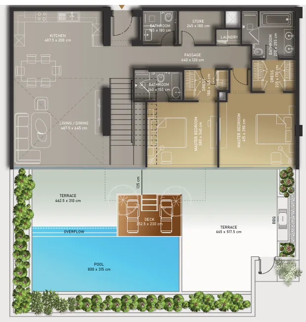 A variety of amenities are available to owners of these apartments on Palm Jumeirah, including 24-hour security and concierge service, a business centre, miniature golf, fitness room, spa area, indoor and outdoor rooftop pools, yoga room, barbecue facilities, children’s playground and lounges. A serviced car park is also provided.