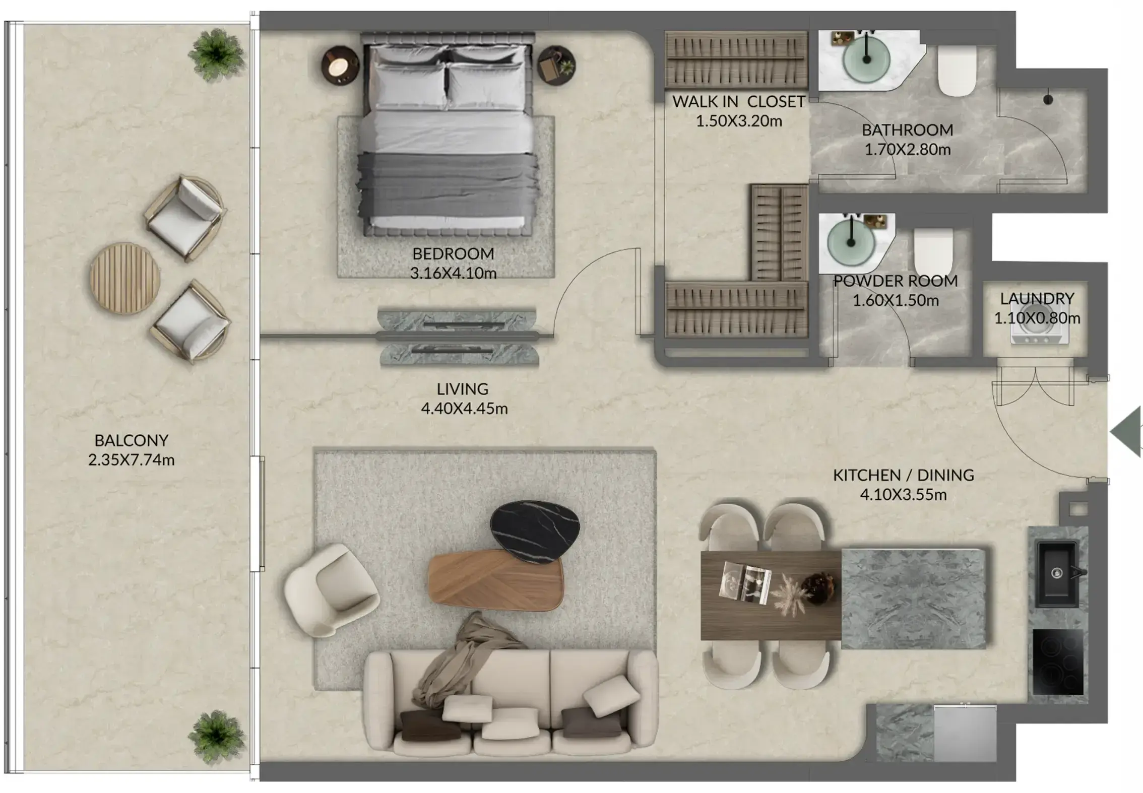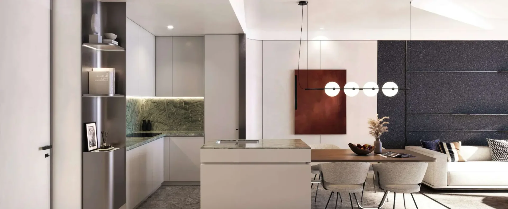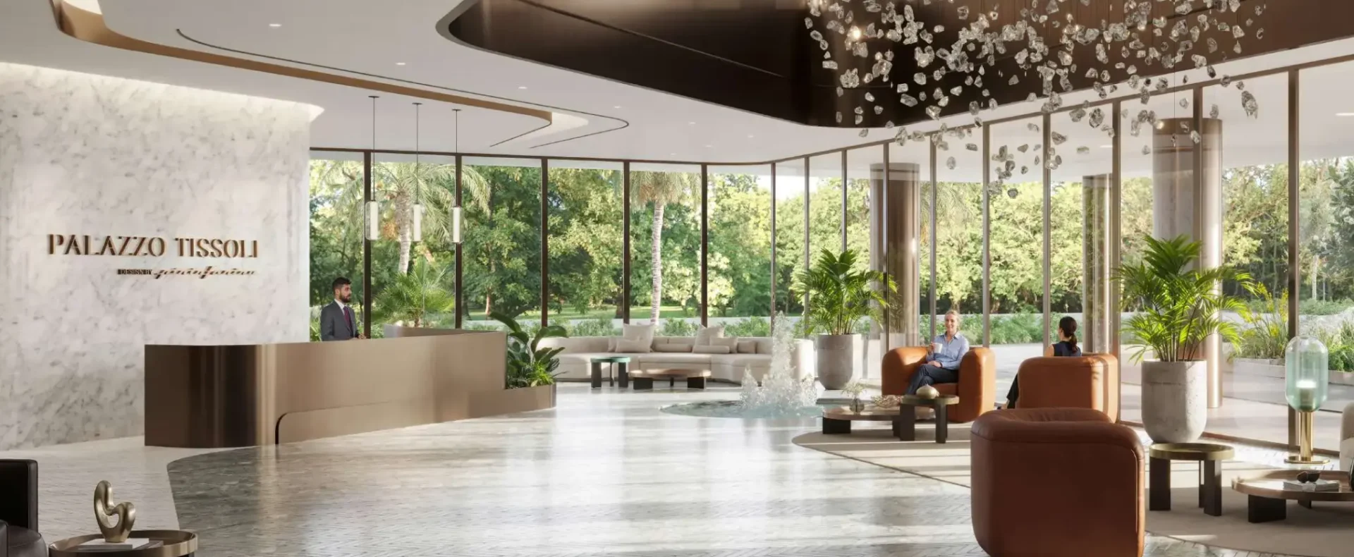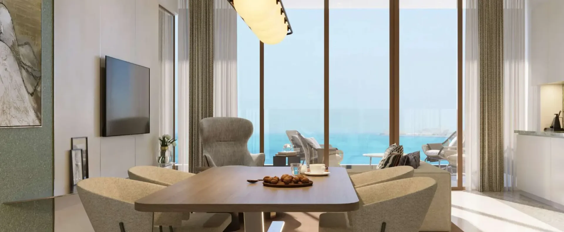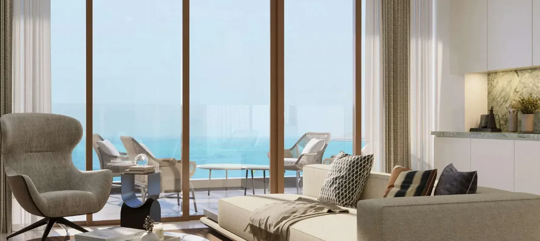 Inside, Palazzo Tissoli translates timeless craftsmanship into living form. Fully furnished studios and one-bedroom apartments reflect the balance between elegance and practicality — stone, wood, and glass form a warm, tactile palette, complemented by bespoke lighting and refined details. Floor-to-ceiling glazing dissolves the boundary between interior and exterior, framing the Arabian Gulf and the Wynn Resort as part of everyday life.