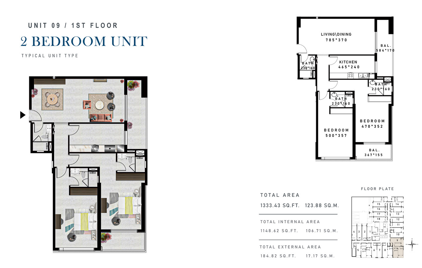 Embrace the utmost comfort and privacy at the living room in each unit with sunny and high ceilings ambiance, porcelain floor, and an open dining area with few of customization option. Bedrooms come with open layout plan in all units, while apartments combine master-bedroom and fully-fitted wardrobes and direct access to the private and large terrace. Modern bathrooms come with a walk-in shower and branded wash basin win en-suite bathrooms. Kitchens exemplify the delightful culinary experiences with neutral colour theme and well-equipped environment.