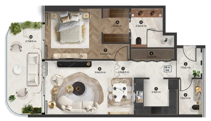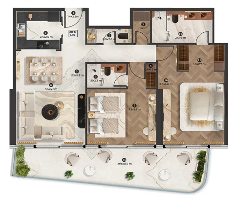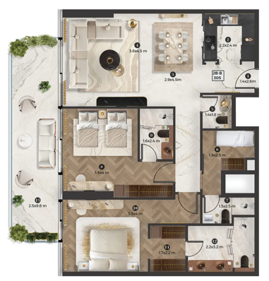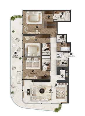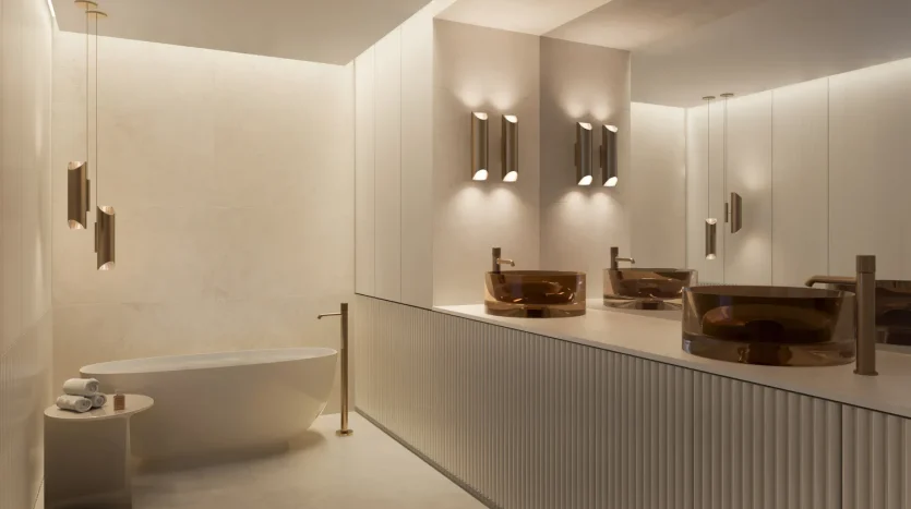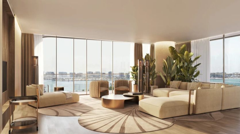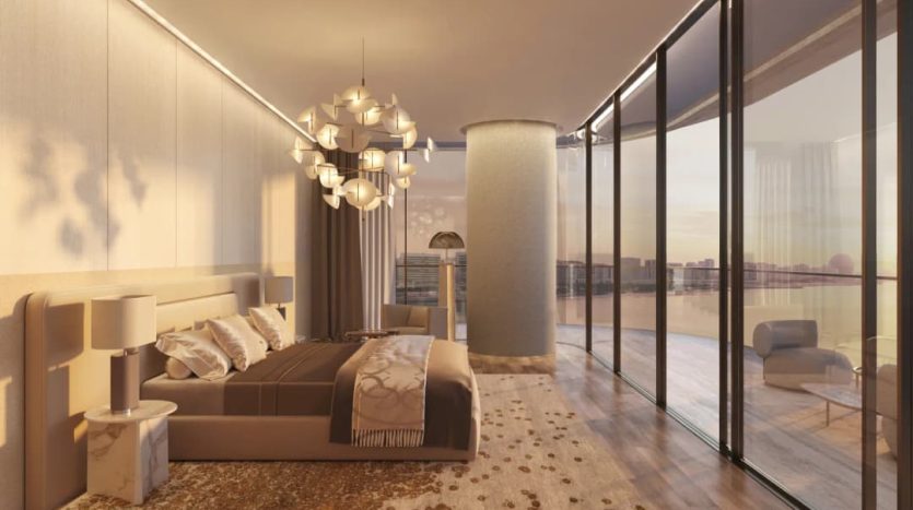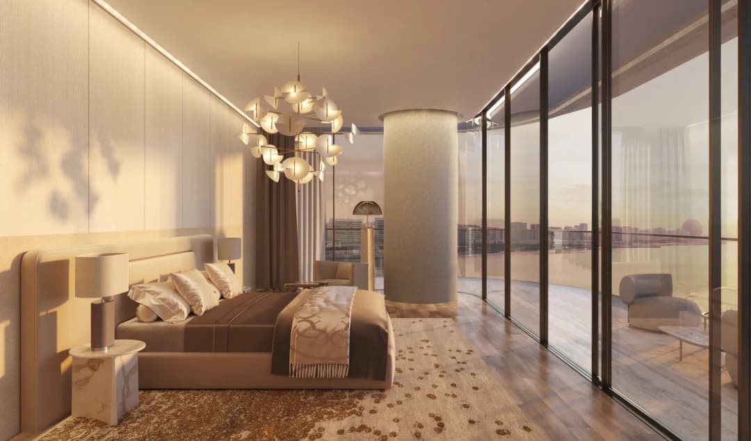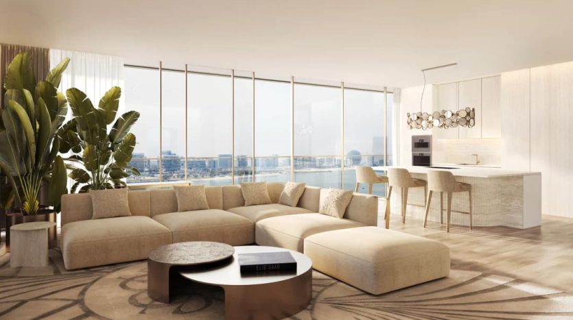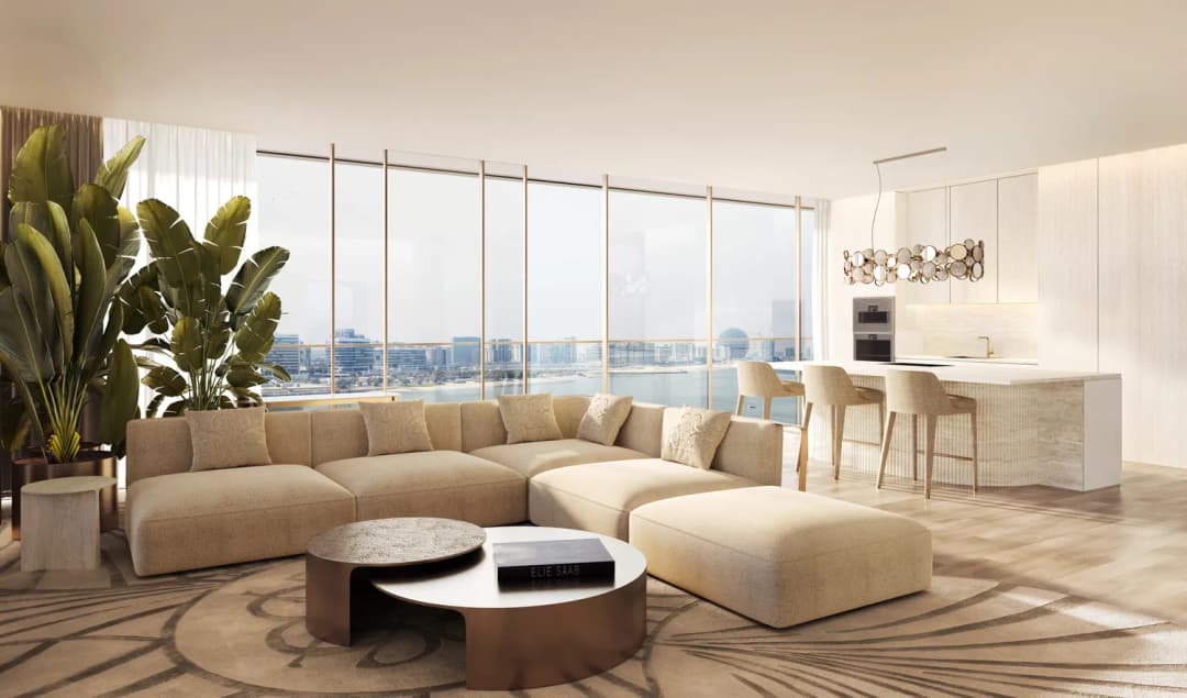 Interiors reflect Elie Saab’s distinctive design language, characterized by refined material contrasts, soft tonal palettes, and sculptural detailing. Finishes include white travertine surfaces, light oak wood, and subtle bronzed accents, creating a warm yet contemporary atmosphere. Kitchens are designed as elegant, functional spaces with integrated cabinetry, stone countertops, and refined detailing that aligns with the overall interior aesthetic. Residences feature curated furnishings and décor from the Elie Saab Maison collection, crafted in Italy, offering a fully coordinated interior environment defined by timeless elegance, craftsmanship, and understated luxury.