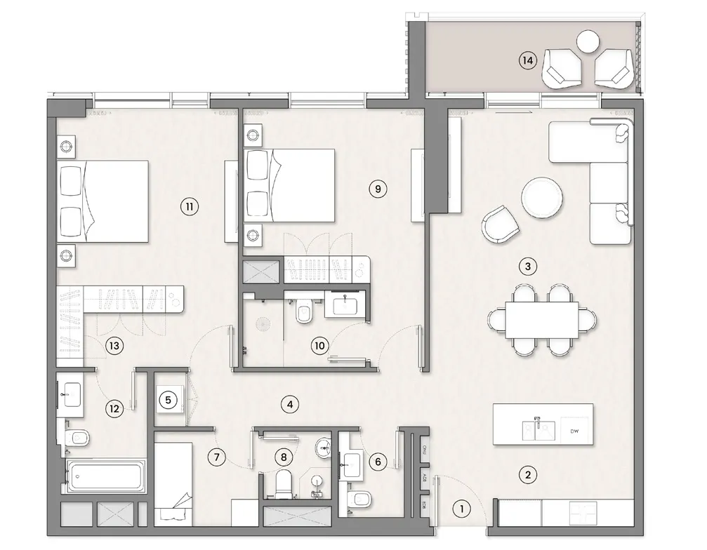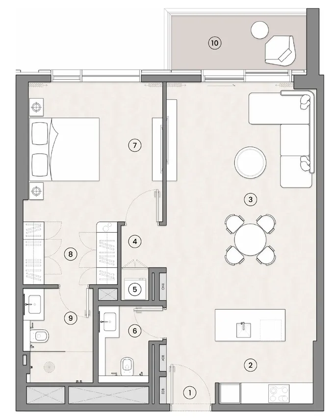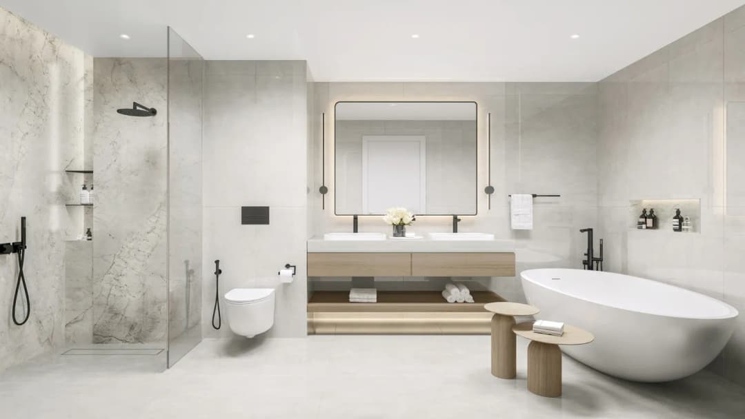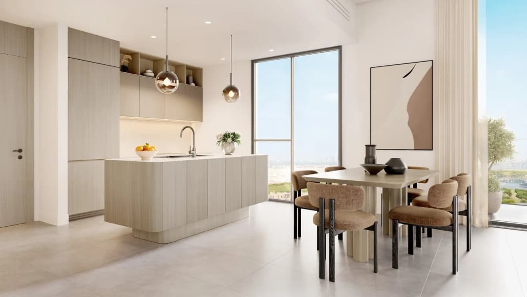 The residences are designed with contemporary interiors that emphasize comfort, practicality, and natural light. Living spaces feature modern finishes and carefully planned layouts that maximize openness and functionality. Kitchens are integrated with sleek cabinetry and dedicated dining areas, creating a seamless connection between cooking and living spaces. Bathrooms are finished in a clean, modern style with refined surfaces, while bedrooms include well-organized layouts with walk-in closets in selected units. Throughout the apartments, the interior palette combines contemporary materials with warm tones to create a calm and welcoming residential atmosphere.