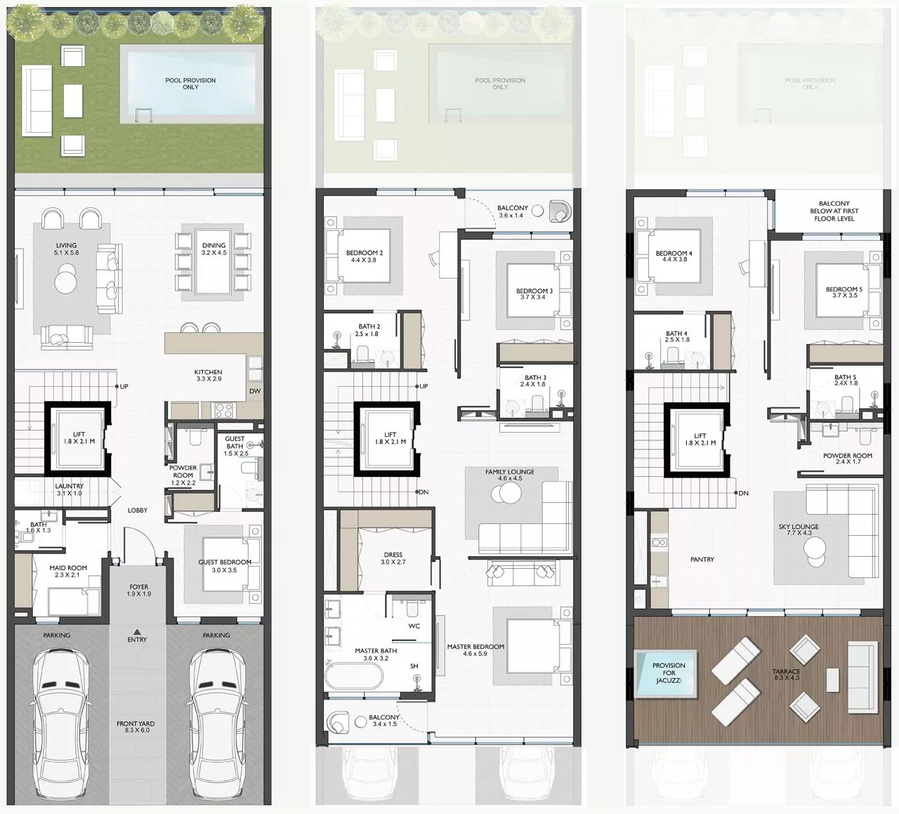 All the properties feature a sky lounge, a terrace and a private backyard. Standalone villas come with a provision for a private cinema, a bar, a personal gym, and a family lounge.