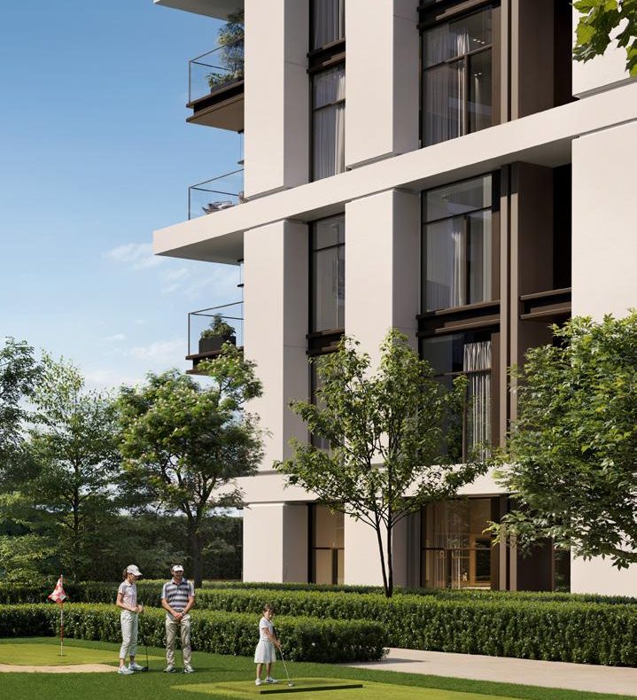 The development is centered around lush landscaped gardens and open spaces, with a podium-level courtyard serving as a gathering spot for relaxation or socializing. Residents can enjoy a variety of amenities, including adult and kids’ pools, a yoga deck, multipurpose sports courts, a mini-golf area, and barbecue spots for evenings with friends and family.