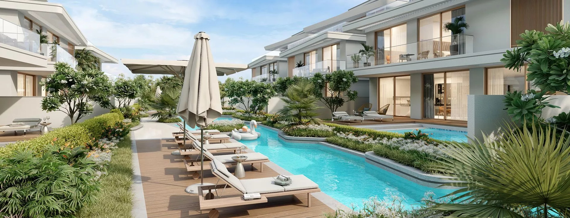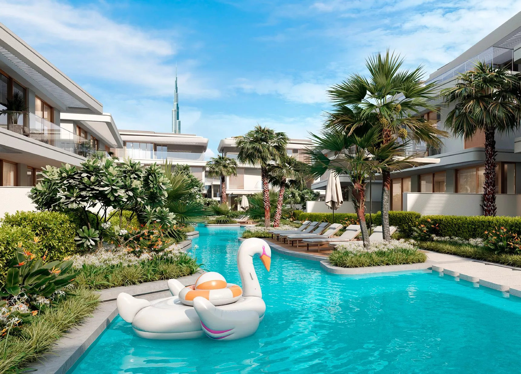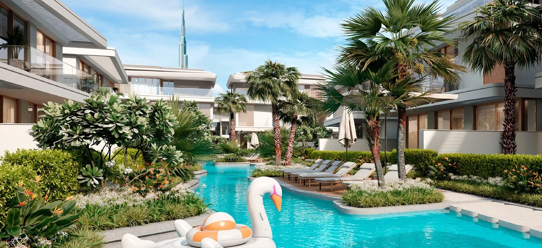 Residents will enjoy exclusive amenities, including a clubhouse, community centre, a temperature-controlled lazy river, and a terrace overlooking the Burj Khalifa. The master plan also includes playgrounds and a school.