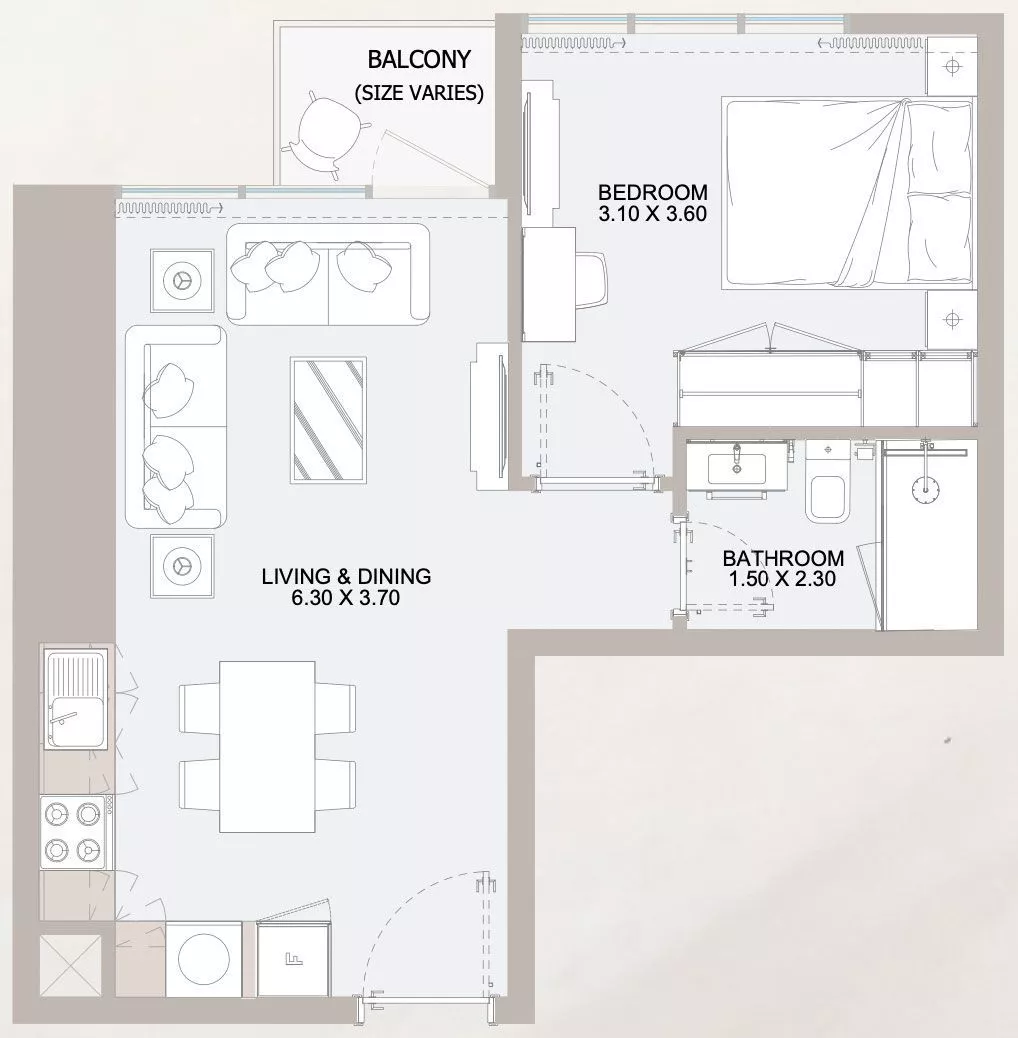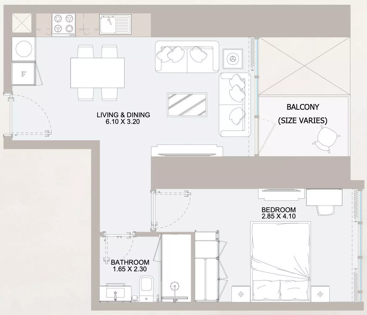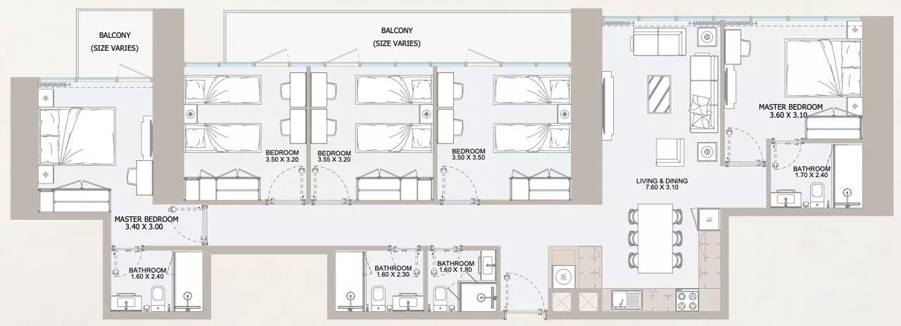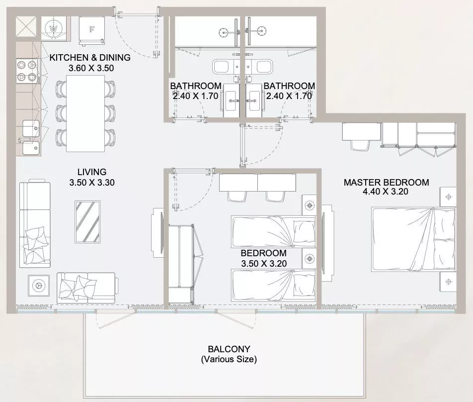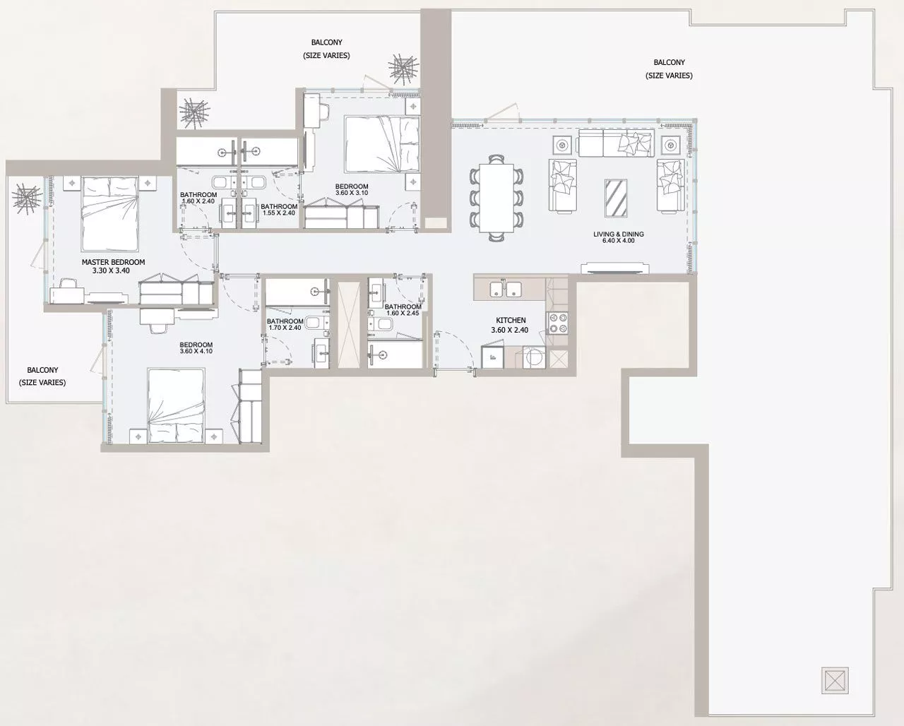 There are 6 podium levels and 39 residential storeys in the skyscraper. The total number of residences in the complex constitutes 622, which are presented by 1–5 bedroom apartments and 3–4 bedroom penthouses. Units come unfurnished and every property offers double-glazed windows and balconies or terraces. Living areas of real estate vary from 495 sq. ft to 3,019 sq. ft.